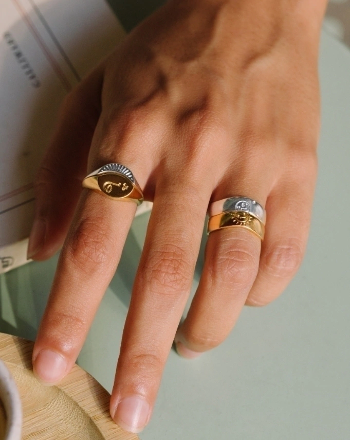Ter os astros nas mãos, como quem sabe da importância da noite e do dia. O descanso necessário ao reparo do corpo, e ao mesmo tempo, a atividade necessária à vida cotidiana. Os dois astros que nos regem, unidos em um anel que pretende ser um lembrete desses dois momentos. O anel é dividido por essas duas metades, a lua com raios de um lado, e o sol representado numa figura desenhada, de outro. Interessante aqui é que apesar de serem duas metades, não possuem o mesmo tamanho.