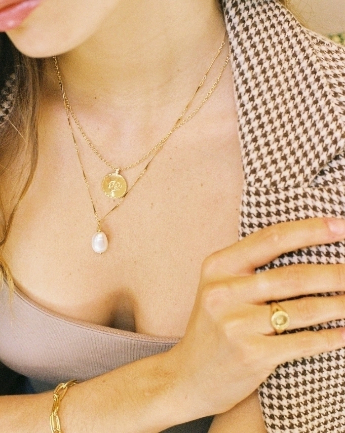 Com uma corrente charmosa e cheia de detalhes que parece ter sido criada em períodos remotos, o colar se deita sobre o colo, deixando a pérola pender em um caimento delicado. A corrente é um pouco mais longa, criando uma imagem que desce pelo desenho do colo, com a pérola natural que finaliza o colar. É uma gema grande, vistosa, que se contrapõe à delicadeza da corrente. Um colar delicado, apesar de sua presença.