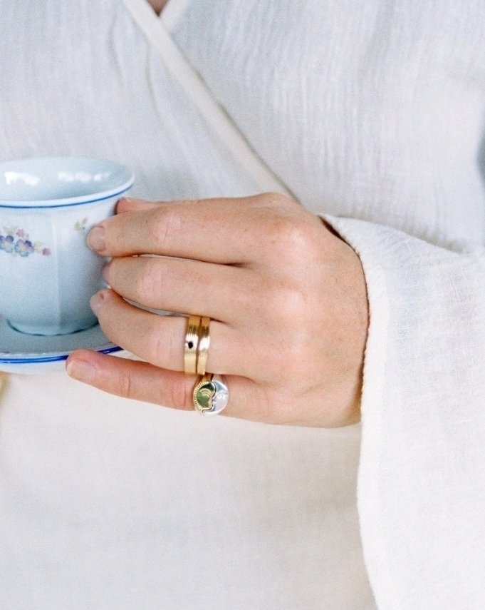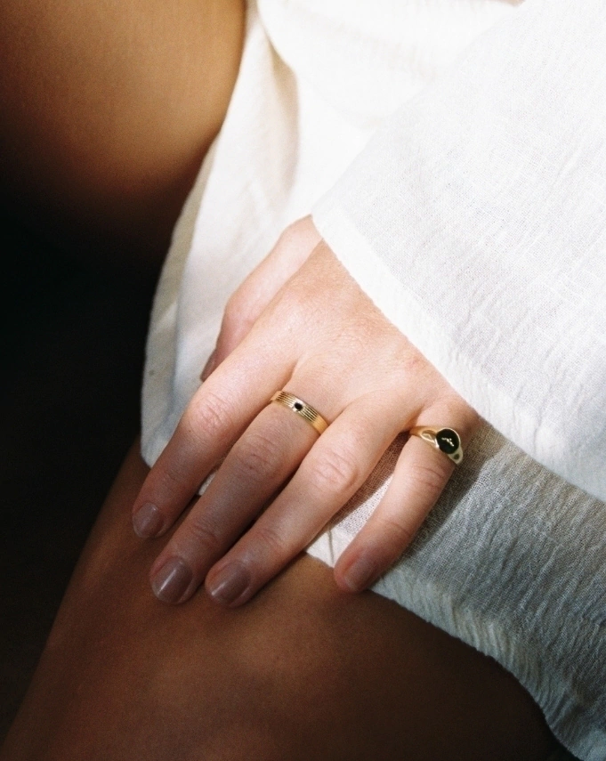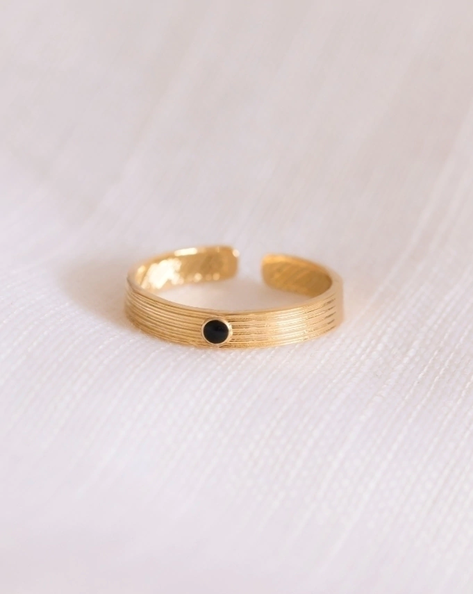 Um anel minimalista, com frisos discretos no seu entorno e um ponto de cor em resina no seu centro. É uma peça clássica, sem excessos e possibilita a exploração de composições com outros anéis. Sua estética é simples, assim como seu formato que é regulável, para que se adapte ao corpo e fique confortável ao vestir.