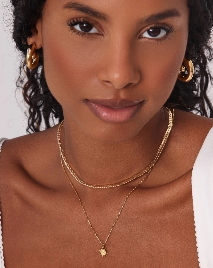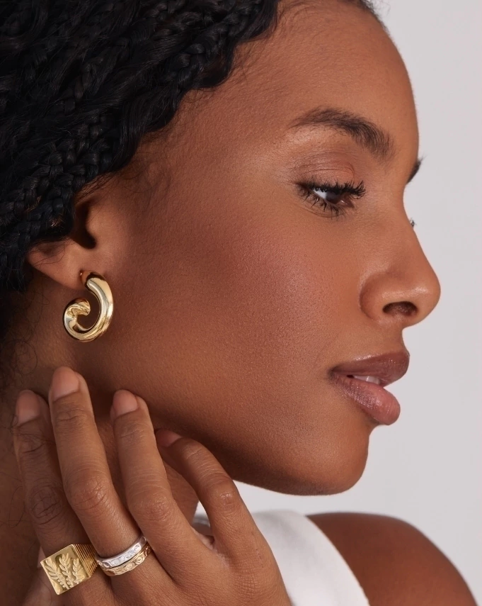 Há um brilho silencioso no Brinco Cálido. Ele tem curvas que lembram um laço de luz, daqueles que se enrolam em nós num fim de tarde quente. O dourado se apoia suavemente no rosto e, de alguma forma, o transforma. É uma peça feita para a estação em que os corpos se permitem mais: mais soltos, mais vivos, mais abertos ao calor.